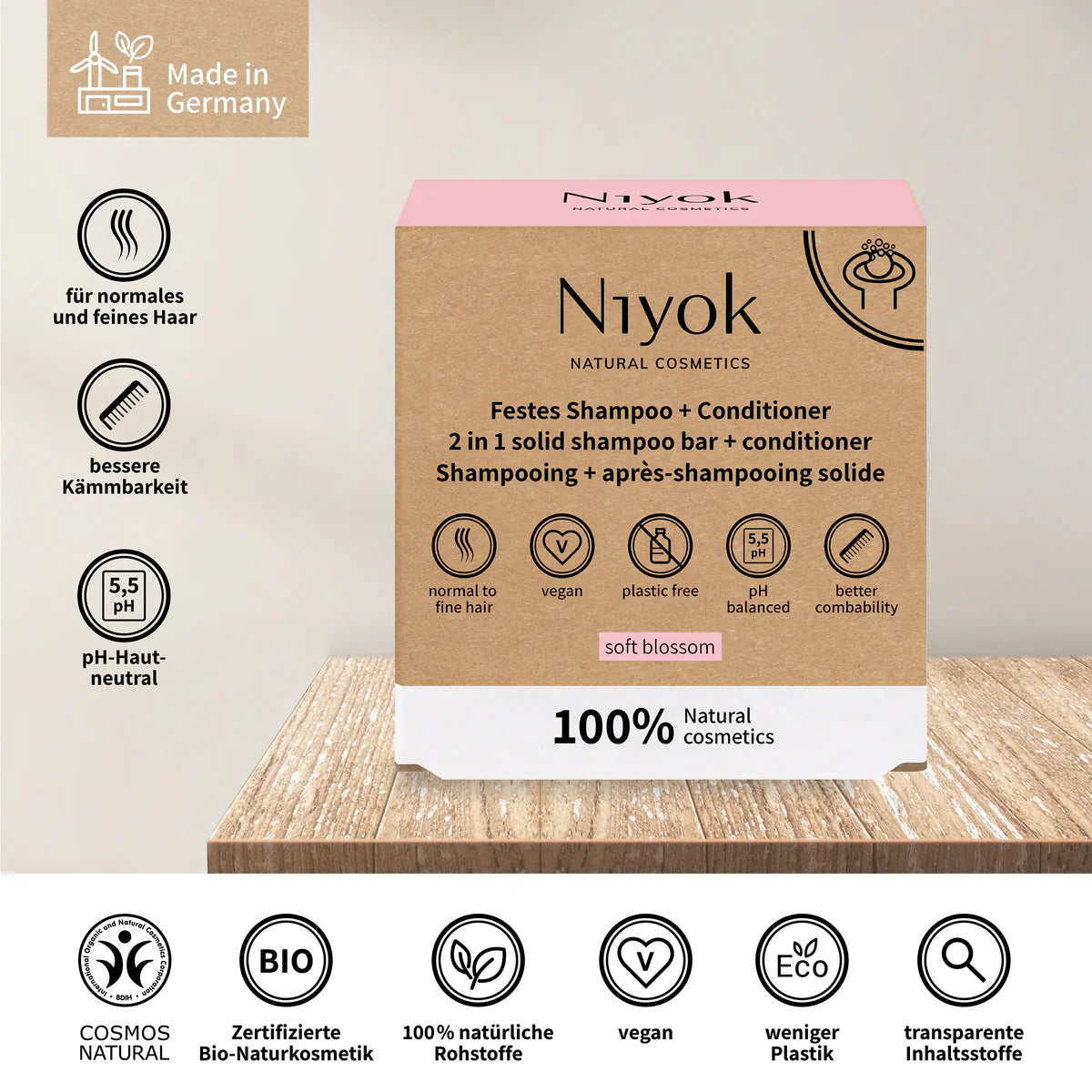 Festes Shampoo + Conditioner (2 in 1) – Soft Blossom by Niyok is used to wash and condition hair in a single product. Here's what it does specifically: