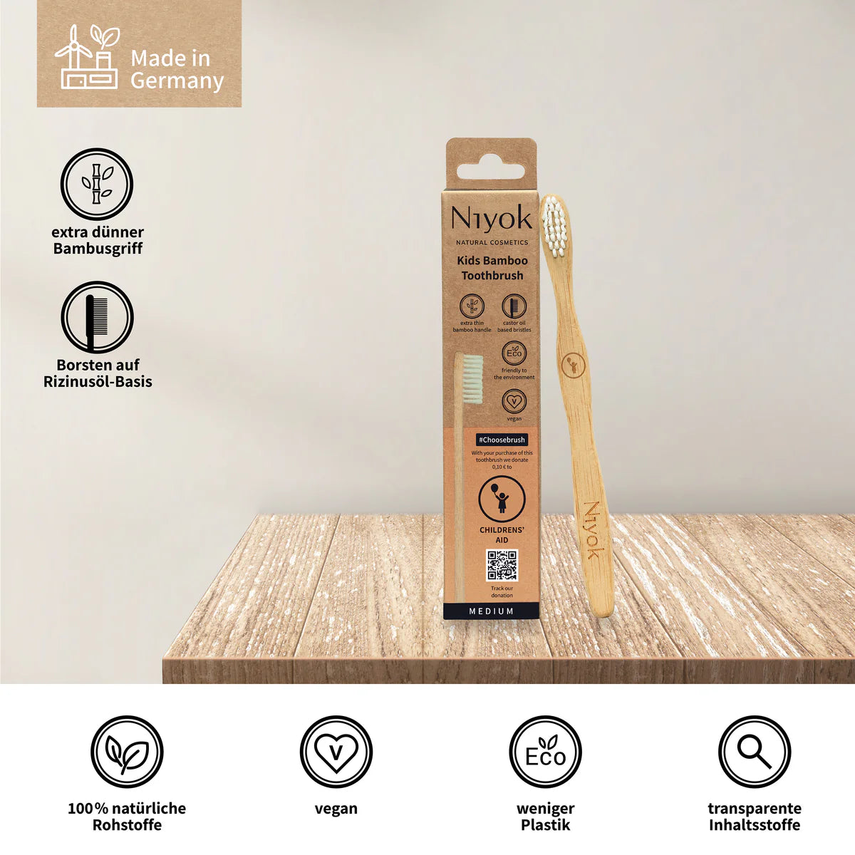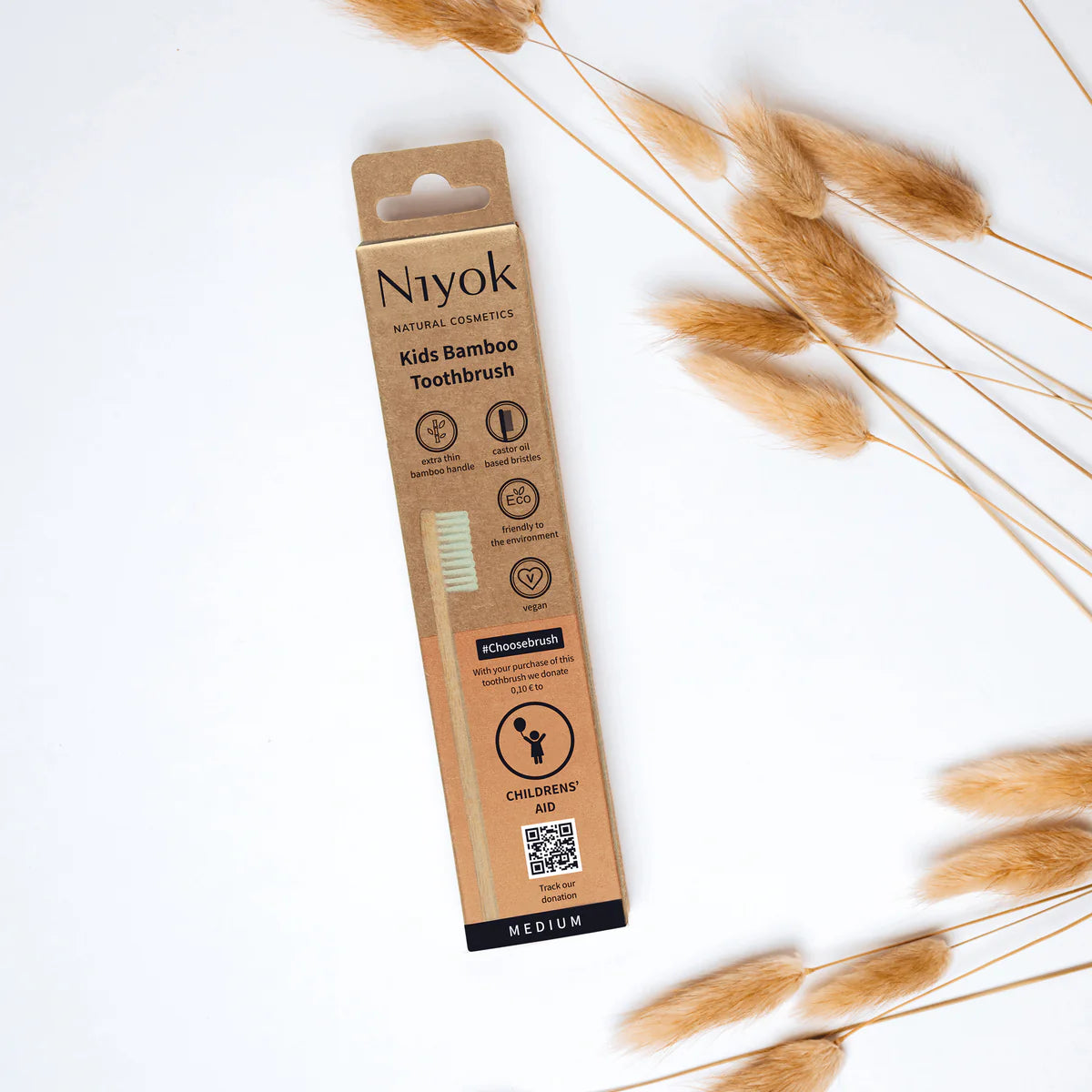 Kinder Bambus Zahnbürste nga firma Niyok është një furçë dhëmbësh ekologjike, e krijuar posaçërisht për fëmijë. Ajo përdoret për: