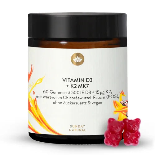 Sunday Natural Vitamin D3+K2 Çocuk Sakızları, 4 yaş ve üzeri çocuklar için özel olarak formüle edilmiş vegan bir takviyedir. Her sakız, çocukların kemik, diş ve bağışıklık sistemi sağlığını destekleyen 500 IU (uluslararası birim) D3 vitamini ve 15 µg all-trans vitamin K2 MK7 içerir. İlave şeker, yapay tatlandırıcı, renklendirici veya aroma içermeyen formülü ve tamamen bitkisel içerik kullanımı, onları sağlıklı bir seçim haline getirir ve vegan beslenme için uygundur.
